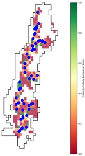 여기서 Sj는 j번째 시설의 수용능력, Pk는 k번째 격자의 고령인구, f(dij)는 거리감쇠 가중치, d0는 임계거리(750m)를 의미한다.