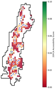 2SFCA 모형을 적용한 접근성 분석 결과는 표 4와 같다. 전체 격자의 평균 접근성 점수는 0.281이며, 최댓값은 0.995, 최솟값은 0.000으로 나타났다. 표준편차는 0.171로 지역 간 접근성 편차가 큰 것으로 분석되었다. 접근성 지니계수는 0.326으로 중간 수준의 불평등을 보였다.