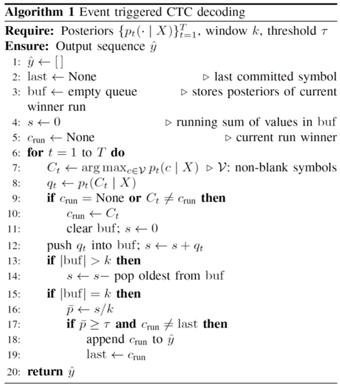 윈도우는 Wt = t−k+1,...,t이다. 커밋은 (i) 동일 클래스가 Wt에 걸쳐 유지되고, (ii) 평균 사후 확률이 τ 이상이며, (iii) 즉각적 반복을 방지하는 경우에만 발생한다. 알고리즘 1은 온라인 이벤트-트리거 디코딩을 나타낸다.