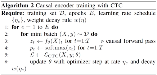 지연을 제어 학습은 인과적 인코더 출력에 CTC를 사용하며, 추론은 (k, τ ) 기반 이벤트-트리거 규칙을 사용한다(그림 1 참조).
